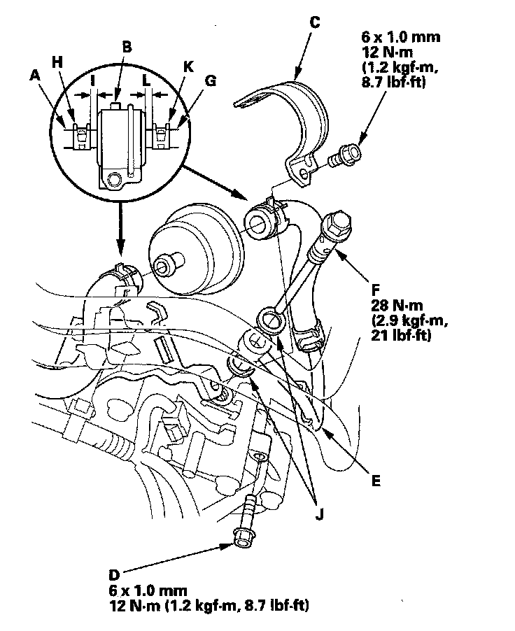 8. Install the ATF filter and ATF inlet line/hose with the joint bolt and new sealing washers (J).