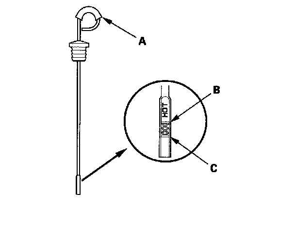 5. Remove the dipstick (A) and check the fluid level. It should be between upper mark (B) and lower mark (C).