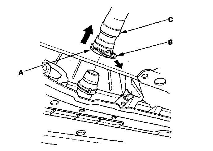 4. Remove the clamp (C) from both ends of the lower radiator hose, and remove them from the thermostat and quick connector.