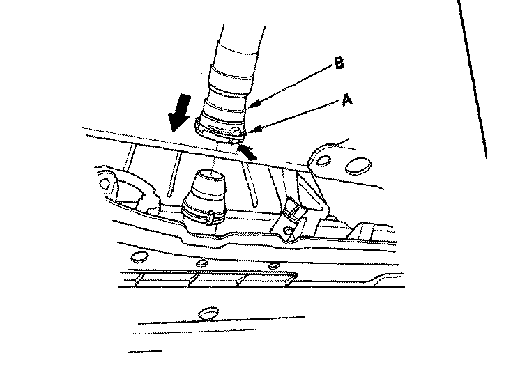 7. Push down the lock (A), then push the quick connector (B) onto the radiator until you hear it click.