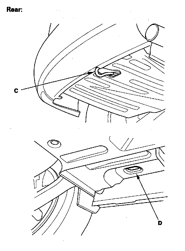 To accommodate flat-bed equipment, the vehicle is equipped with front towing hooks (A), front tie down hook slots (B), a rear towing hook (C), and rear tie down hook slots (D).