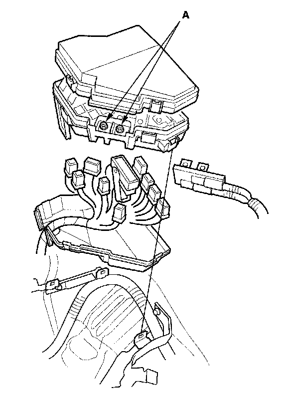 4. Remove the screws (A) for the alternator and battery cable terminals from the under-hood fuse/relay box.