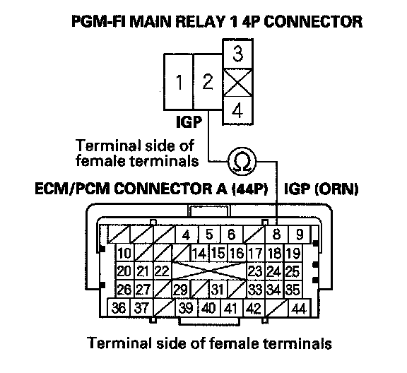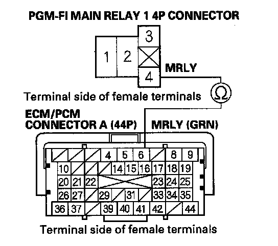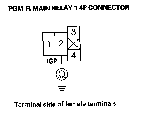 39. Check for continuity between body ground and PGM-FI main relay 1 4P connector terminals No.1 and No.3 individually.
