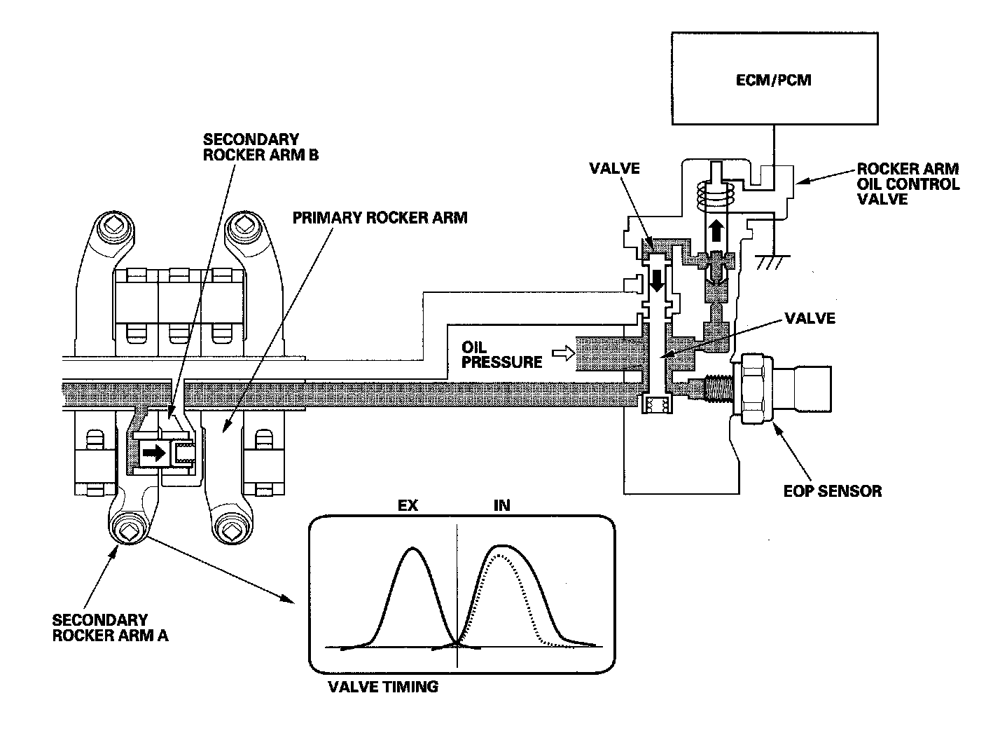 This forces the VTEC switching piston into secondary rocker arm A against the return spring and disengages the secondary arm A from the secondary arm B to stop valve actuation.