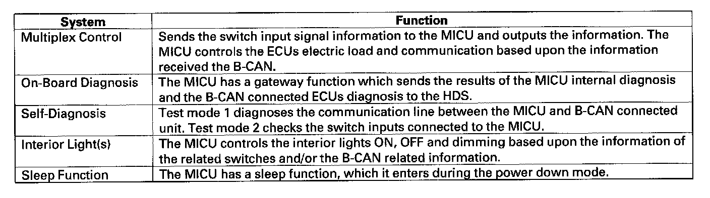 The MICU is a gateway between the HDS and B-CAN related ECUs, and sends B-CAN diagnostic results to the HDS.