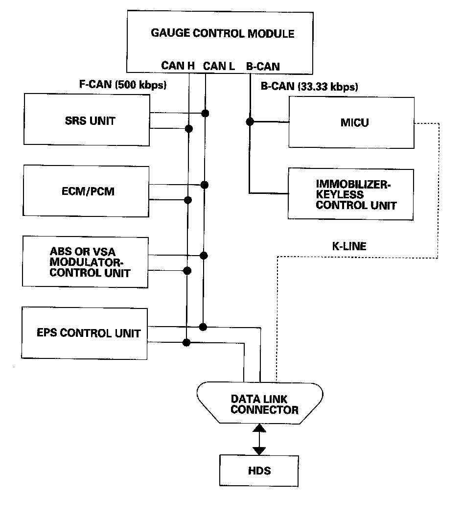 By connecting the HDS to the data link connector (DLC), the HDS can retrieve the diagnostic results from the MICU via a diagnostic line called K-LINE. The K-LINE is distinguished from the CAN line, and connected to the CAN related ECUs.