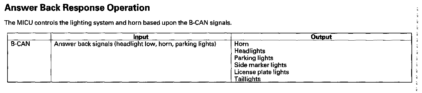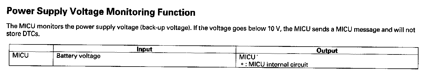 When any of the data from the B-CAN circuit cannot be received within a specified time, or an unusual combination of the data is recognized, the MICU moves to the software fail-safe mode. The data that cannot be received is forced to a pre-programmed value.