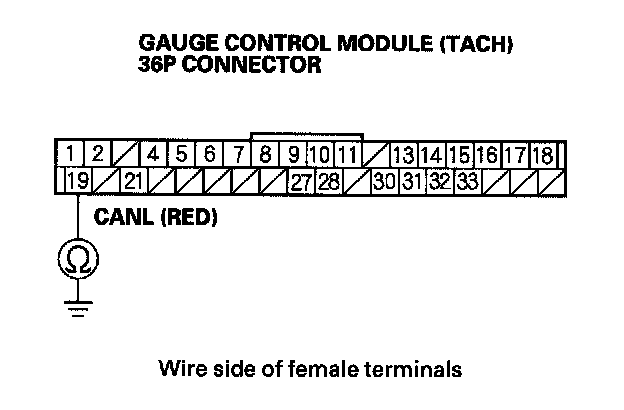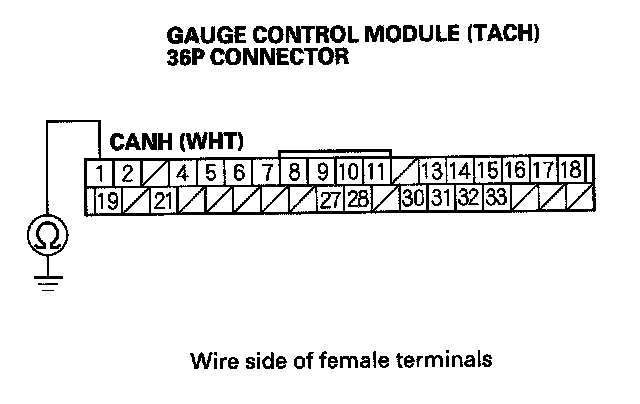 15. Check for continuity between gauge control module (tach) 36P connector terminal No.19 and body ground.