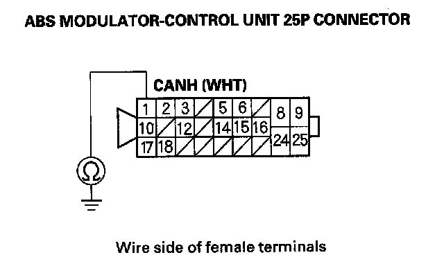 16. Check for continuity between ABS modulator-control unit 25P connector terminal No.17 and body ground.