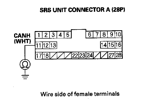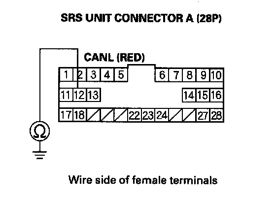 17. Check for continuity between SRS unit connector A (28P) terminal No.12 and body ground.