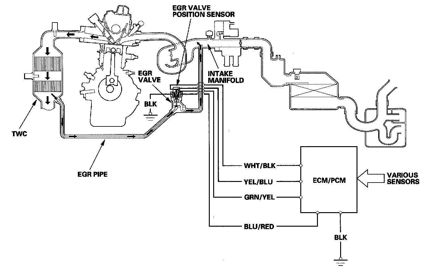The EGR system reduces oxides of nitrogen (NO(x)) emissions by recirculating exhaust gas through the EGR pipe and the intake manifold, and into the combustion chambers. Routing the exhaust gas through the EGR pipe helps to prevent carbon deposits from forming in the intake manifold and the throttle body. The ECM/PCM memory includes the ideal EGR valve position for varying operating conditions.