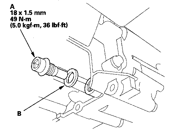 7. Reinstall the drain plug with a new sealing washer (B).
