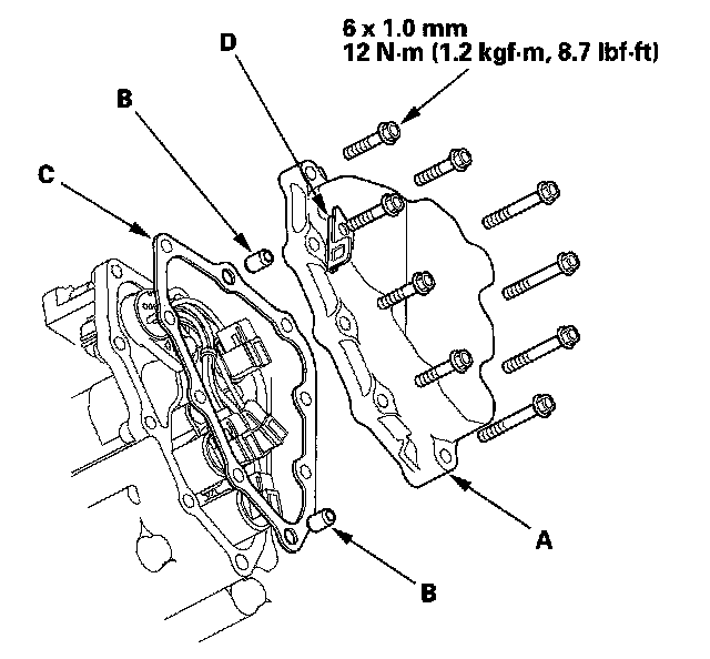 8. Remove the shift solenoid valve cover (A), dowel pins (B), gasket (C), and harness clamp bracket (D).