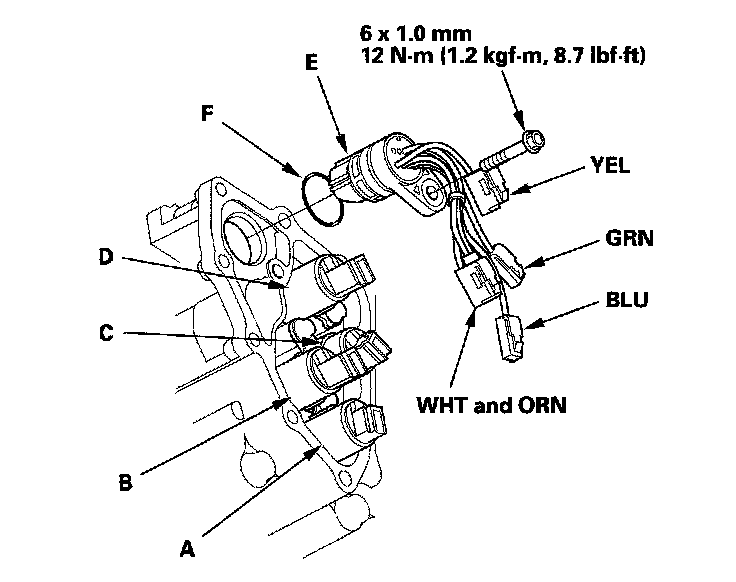 10. Install a new O-ring (F) on the new shift solenoid harness connector, and install the connector in the transmission housing.