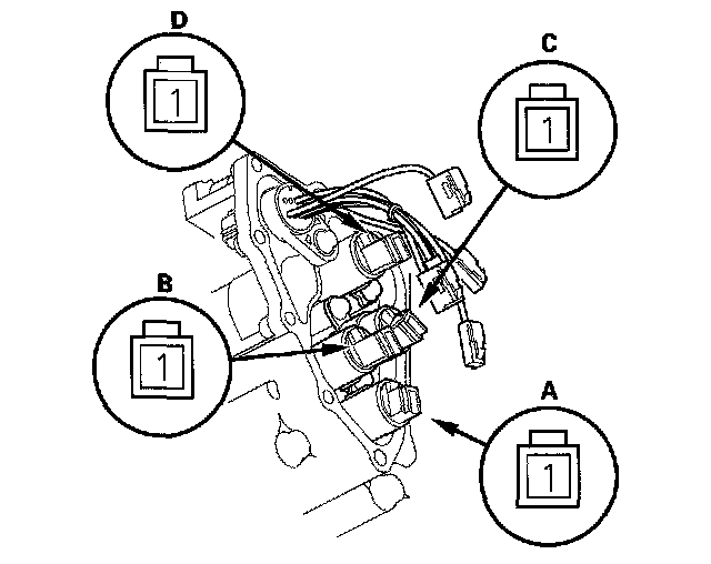 12. Disconnect the connectors from shift solenoid valve A, shift solenoid valve B, shift solenoid valve C, and shift solenoid valve D.