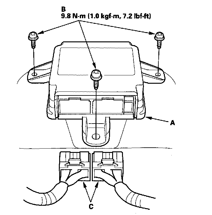 1. Install the new SRS unit (A) with TORX bolts (B), then connect the connectors (C) to the SRS unit; push them into position until they click.