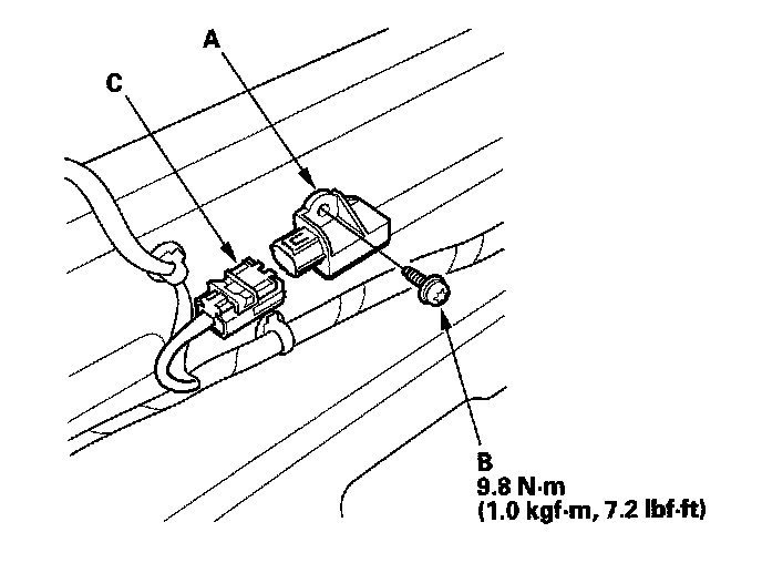 1. Install the new rear safing sensor (A) with a TORX bolt (B) then connect the floor wire harness 4P connector (C) to the rear safing sensor.