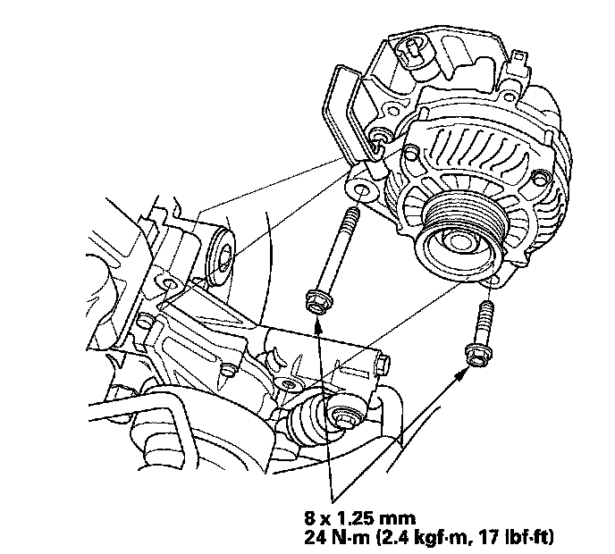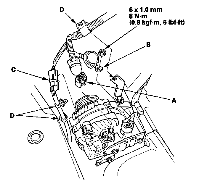 3. Install the harness connector (C) and harness clamp (D) to the alternator.