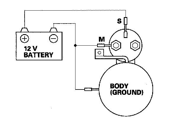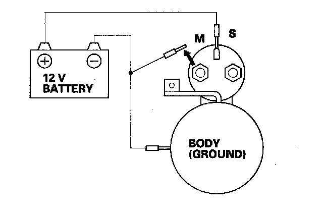 3. Connect the battery as shown. Make sure you disconnect the starter motor wire from the solenoid. If the starter pinion moves out, it is working properly.