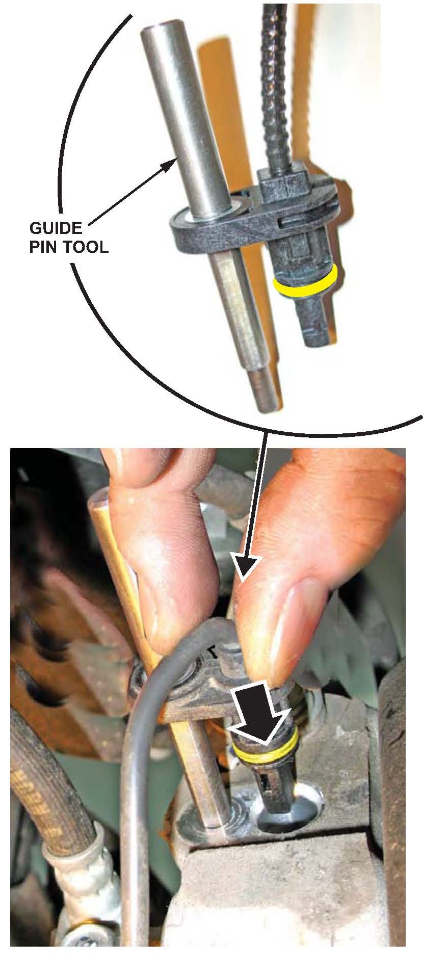 7. Insert the guide pin tool into the ABS wheel speed sensor bolt hole until the shoulder of the tool contacts the ABS wheel speed sensor bracket.