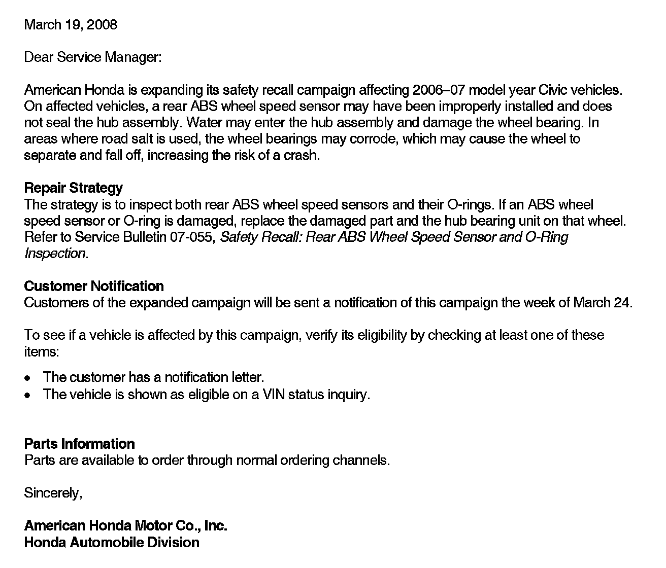 Recall - Rear Wheel Speed Sensor Inspection/Replacement: Overview