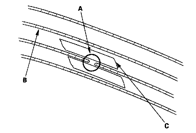 2. Carefully mask above and below the broken portion of the defogger wire (B) with cellophane tape (C).