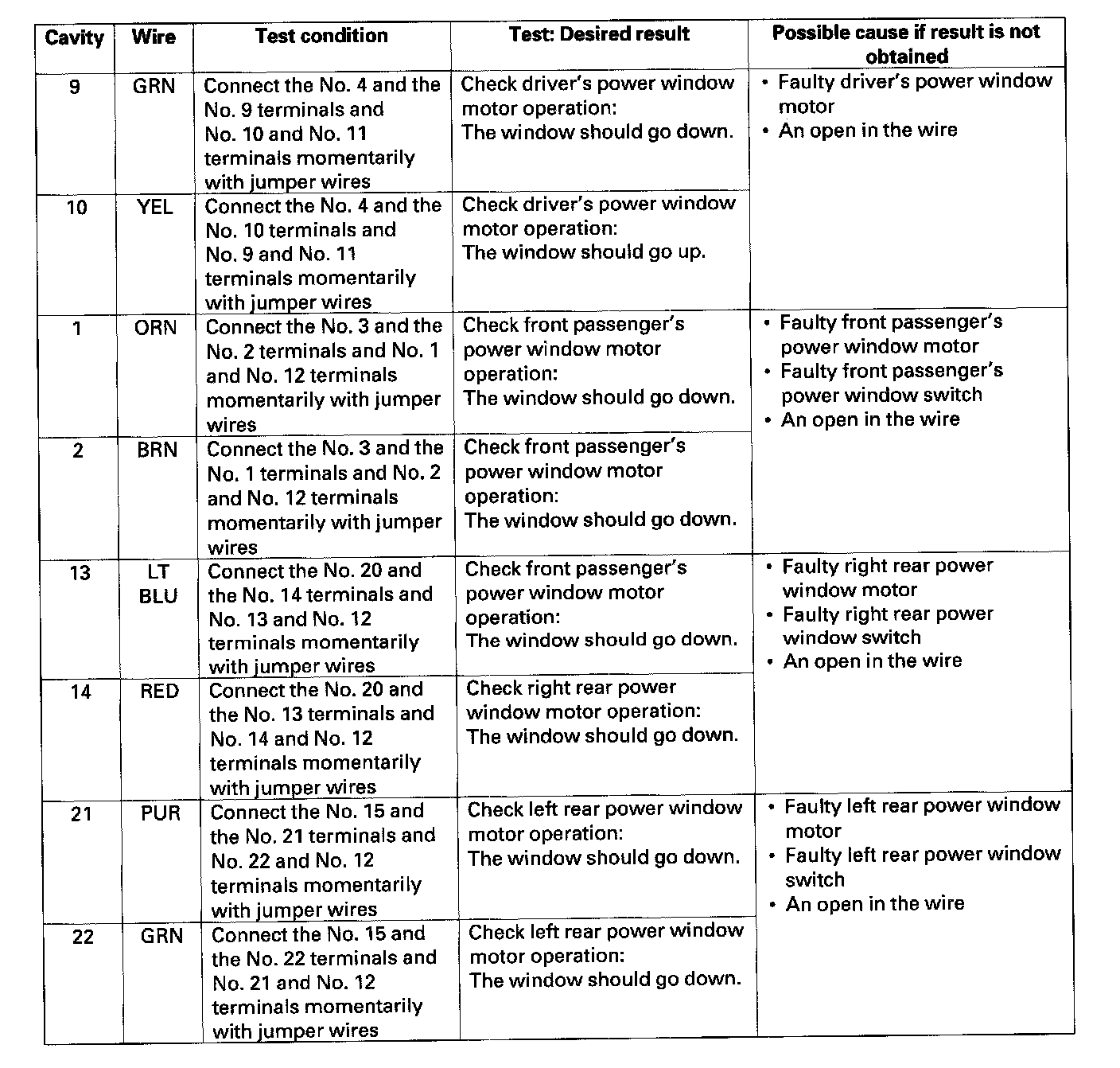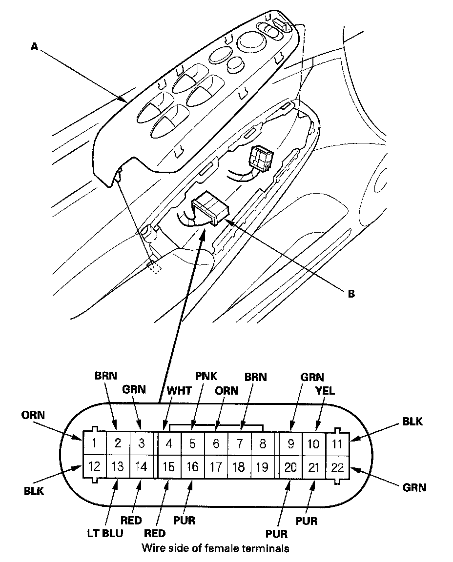 5. Reconnect the 22P connector to the power window master switch. Turn the ignition switch ON (II), and make these input tests at the connector.