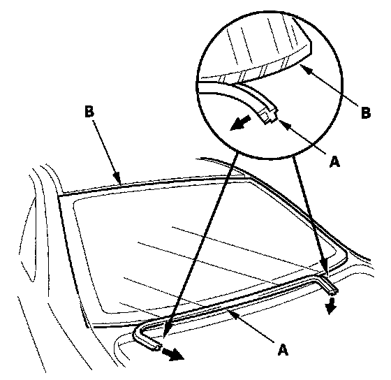 6. Remove the lower rubber dam (A) from the lower edge of the rear window (B). If necessary, cut the molding with a utility knife.