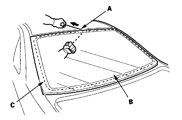 14. Apply primer to the edge of the rear window (A) where the lower rubber dam adhesive tape will be attached as shown. Attach the lower rubber dam (B) with adhesive tape (C) to the lower edge of the rear window:
