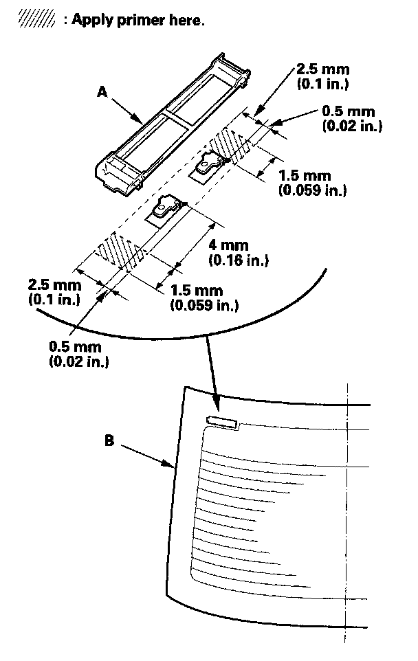 13. Attach the window antenna terminal cover base (A) with adhesive tape to the inside face of the rear window (B) as shown. Apply primer to the inside face of the rear window as shown.