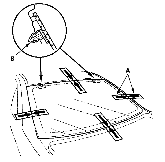 17. Set the rear window in the opening, and center it. Make alignment marks (A) across the rear window and body with a grease pencil at the four points shown. Make sure both upper clips (B) are in the body holes. Be careful not to touch the rear window where adhesive will be applied.