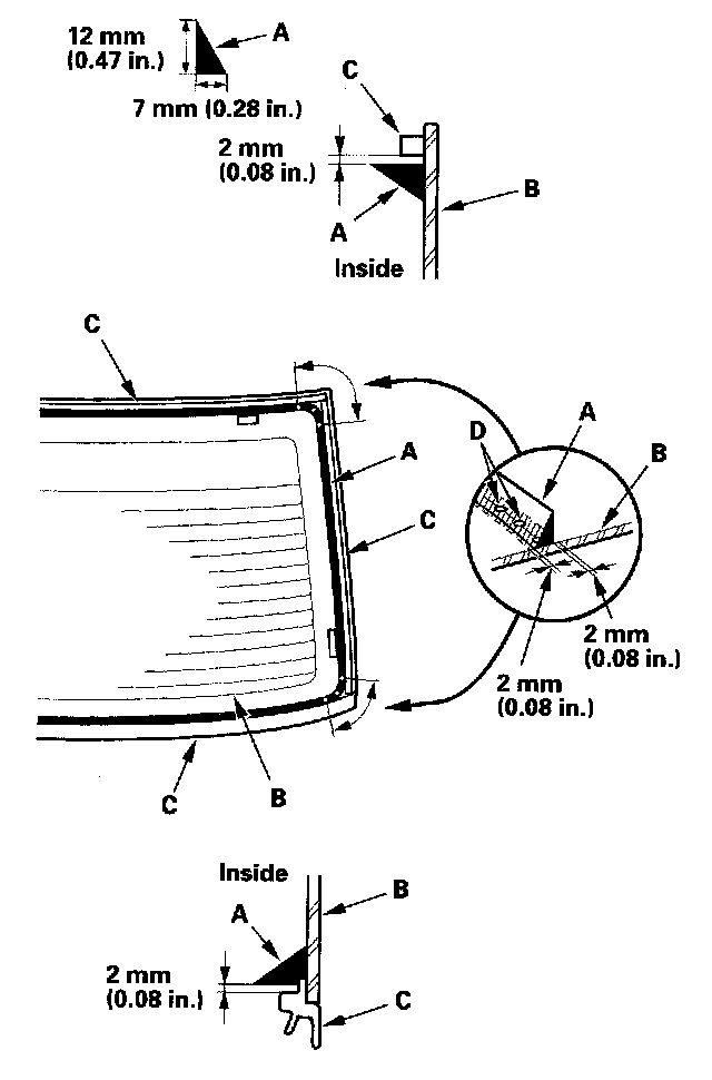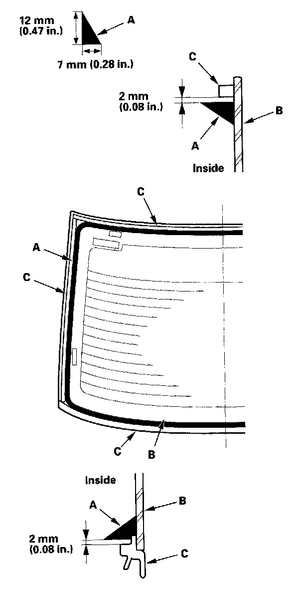 20. Pack adhesive into the cartridge without air pockets to ensure continuous delivery. Put the cartridge in a caulking gun, and run a bead of adhesive (A) around the edge of the rear window (B) between the dams (C) as shown: