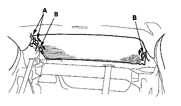 5. Pull down the rear portion of the headliner (A) by detaching the clips (B). Take care not to bend the headliner excessively, or you may crease or break it.