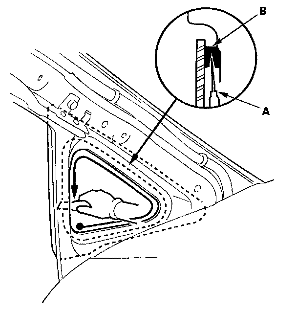 2. From inside the vehicle, use a knife (A) to cut through the front corner glass adhesive (B) all the way around. Apply protective tape along the edge of the entire front corner glass opening flange.