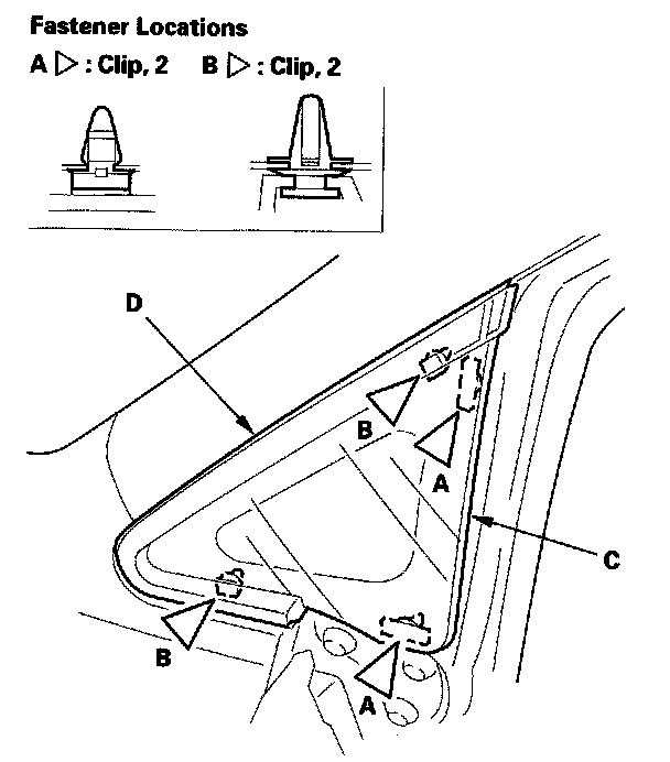 3. From outside the vehicle, pry the front corner glass clips (A) and the front corner trim clips (B), then carefully remove the glass (C) and trim (D) together. The trim has not be attached to the glass.