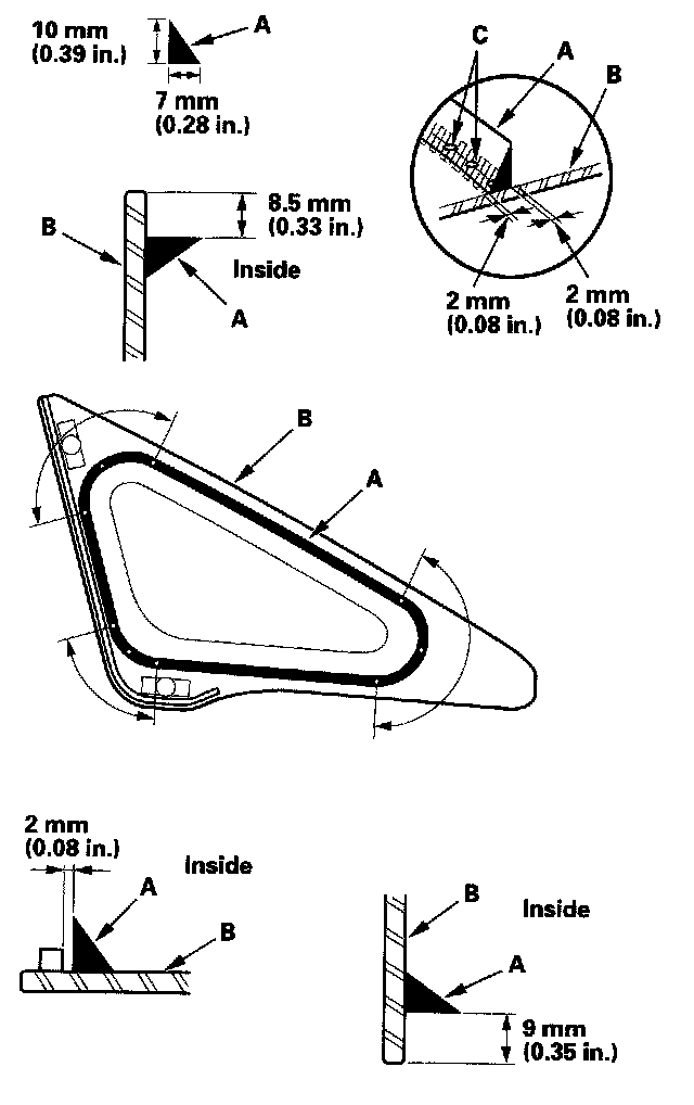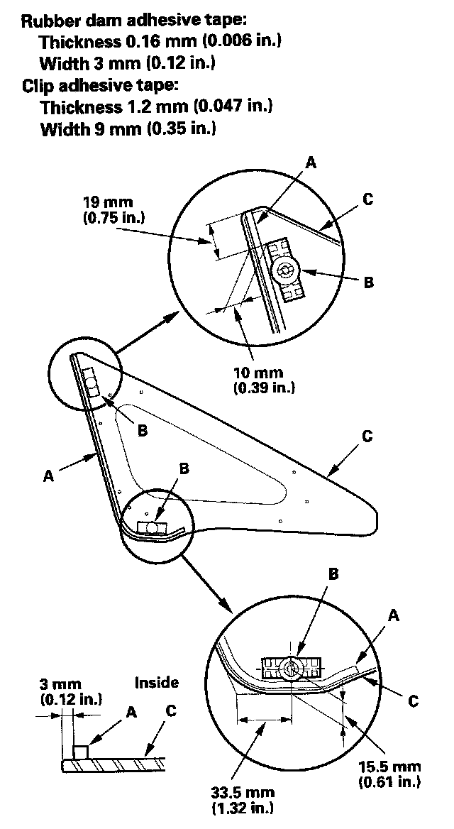 7. Attach the rubber dam (A) and clips (B) with adhesive tape to the inside face of the front corner glass (C) as shown. Be careful not to touch the front corner glass where adhesive will be applied.