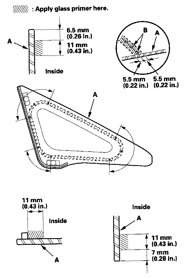 - With the printed dots (B) on the front corner glass as a guide, apply the glass primer to both lower corner portions of the front corner glass.
