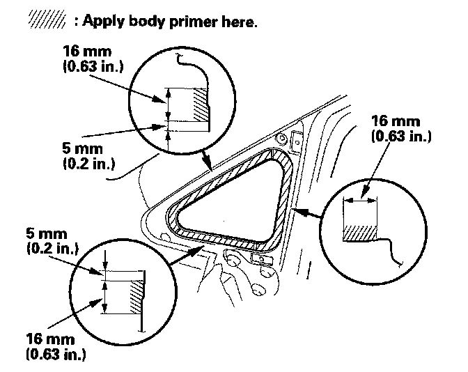 - Never touch the primed surfaces with your hands. If you do the adhesive may not bond to the front corner glass properly, causing a leak after the front corner glass is installed.