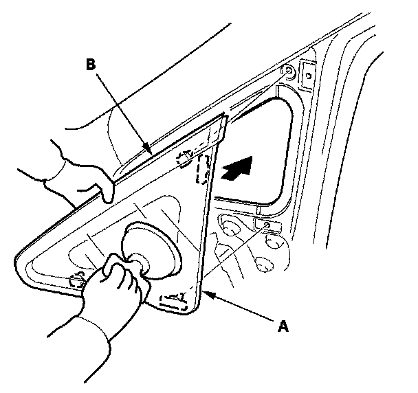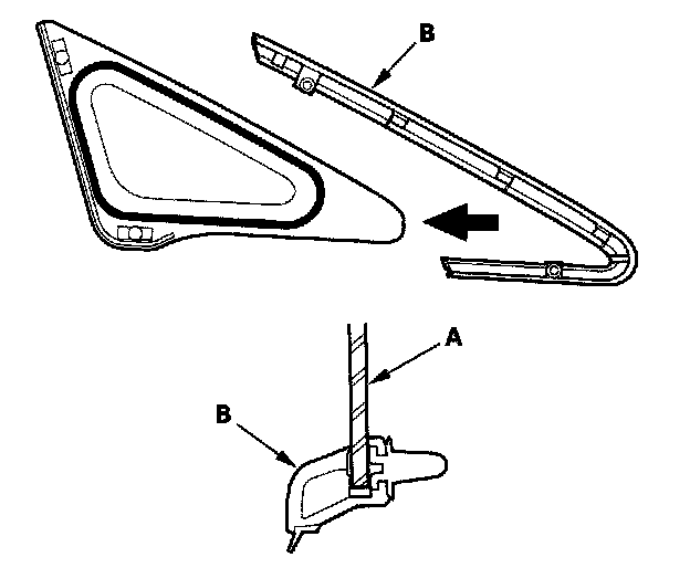 12. Set the front corner glass (A) to the front corner trim (B) quickly. Be careful not to touch the front corner glass where adhesive will be spread.