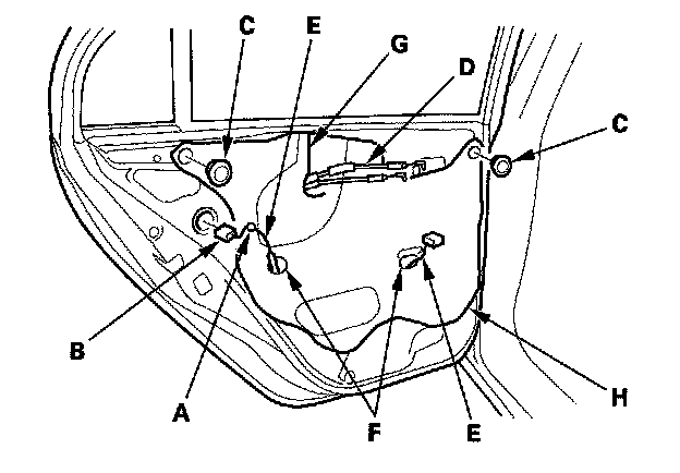 2. Detach the harness clip (A), and disconnect the power door lock actuator connector (B). Remove the plug caps (C).