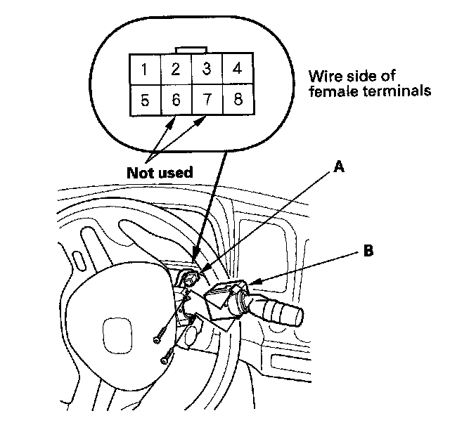 2. Disconnect the dashboard wire harness 8P connector (A) from the wiper/washer switch (B).