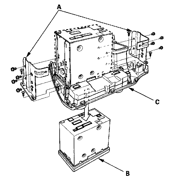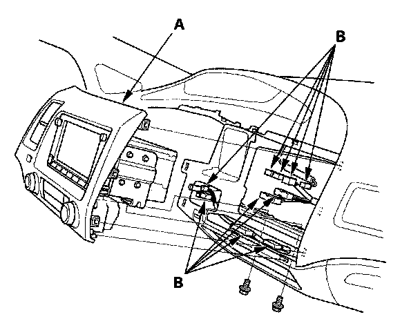 5. Remove the screws, brackets (A), and the navigation unit (B) from the center panel (C).