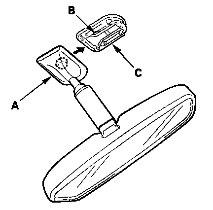 2. Slide the rearview mirror (A) down toward the bottom of the windshield to detach it from the spring (B) in the mount (C).