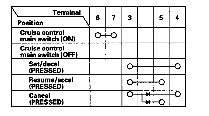 - If there is continuity, and it matches the table, but switch failure occurred on the cruise control input test, check and repair the wire harness on the switch circuit.