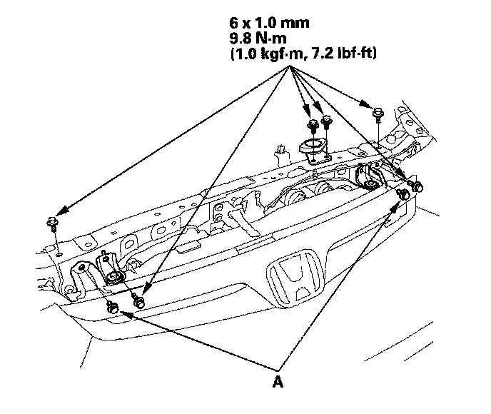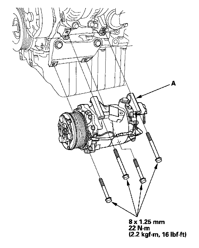 10. Remove the mounting bolts and the A/C compressor (A). Be careful not to damage the radiator fins when removing the A/C compressor.