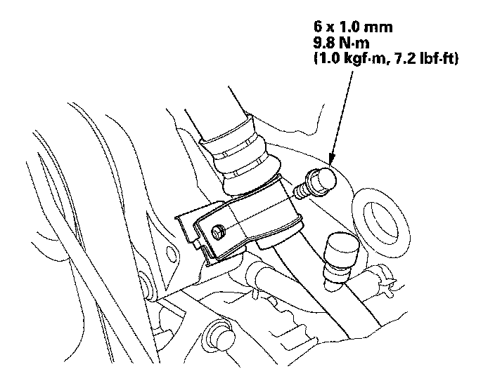 9. Disconnect the connector (A). Remove the bolt and the nut. then disconnect the suction hose (B) and discharge hose (C) from the A/C compressor. Plug or cap the lines immediately after disconnecting them to avoid moisture and dust contamination.
