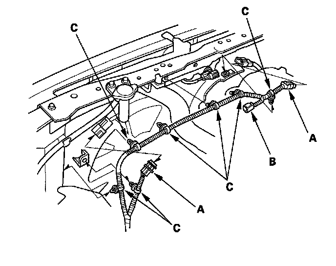 6. Disconnect the fan motor connectors (A) and hood switch connector (B), then remove the harness clamps (C).