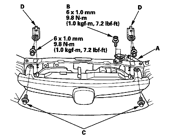 7. Remove the reservoir hose (A), radiator cap base mounting bolts (B), clips (C), and radiator upper brackets (D).