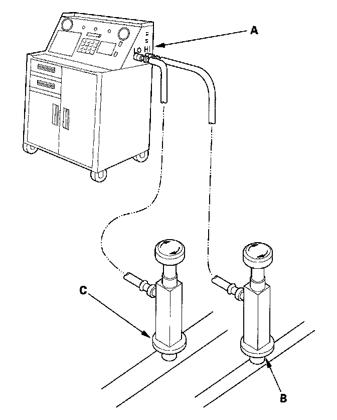 1. Connect an R-134a refrigerant recovery/recycling/charging station (A) to the high-pressure service port (B) and the low-pressure service port (C), as shown, following the equipment manufacturer's instructions.