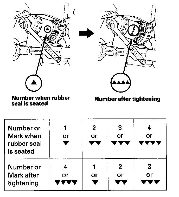 ^ Spin the filter on until its seal lightly seats against the oil cooler, and note which number or mark is at the bottom.